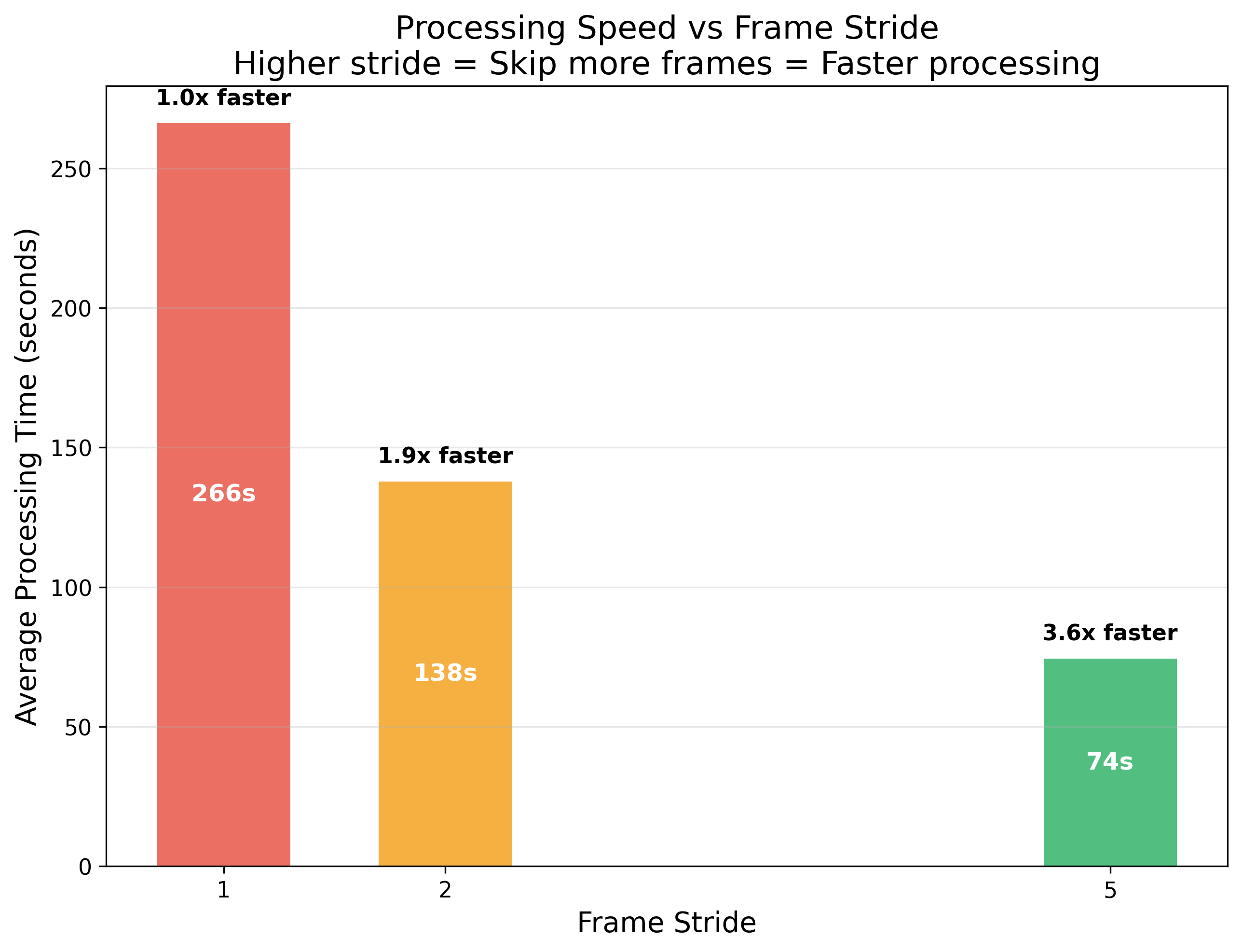 stride=1(every frame): ~4 FPSstride=2(every other frame): ~8 FPS (2x speedup!)stride=5(every 5th frame): ~20 FPS (5x speedup)