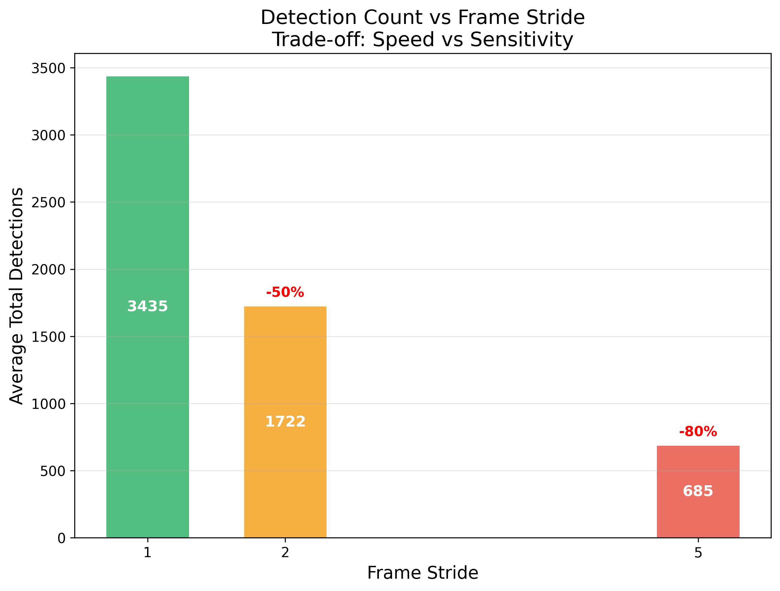 At first glance, the Pareto frontier result might seem counterintuitive (It was hard for me to understand) higher processing time appears “worse.” But in this context, time is not the enemy: it’s the trade-off variable. Increasing frame stride reduces computation by skipping frames, but if recall stays nearly constant, that extra “efficiency” means the model is doing less work for the same detections. The sweet spot (stride = 2) emerges precisely where we minimize processing time without sacrificing detections not where we simply run fastest.